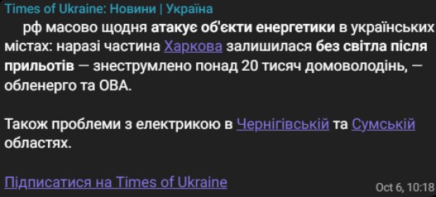 ПодписатьсяСогласно сообщениям областных энергетических служб и местных администраций, в результате недавних атак часть Харькова осталась без электричества, десятки тысяч домохозяйств пострадали. Перебои с электроснабжением также зафиксированы в Черниговской и Сумской областях.