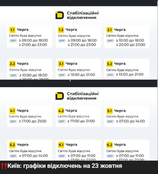 З четверга, 23 жовтня, у більшості регіонів України набудуть чинності нові відключення світла. За даними оператора енергосистеми «Укренерго», погодинні графіки відключень діятимуть з 7:00 до 23:00.